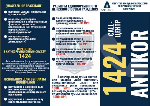 Формы стимулирования Правительство Республики Казахстан утвердило правила поощрения лиц, сообщивших о факте коррупционного правонарушения или иным образом оказывающих содействие в борьбе с коррупцией (Постановление Правительства Республики Казахстан от 30 декабря 2015 года № 1131). Для лиц, сообщивших о факте коррупционного правонарушения или иным образом оказывающих содействие в противодействии коррупции, устанавливаются поощрения, осуществляемые в форме единовременного денежного вознаграждения.